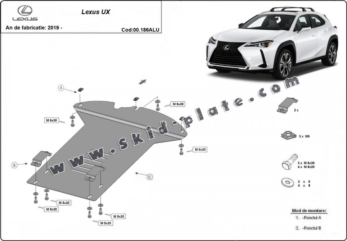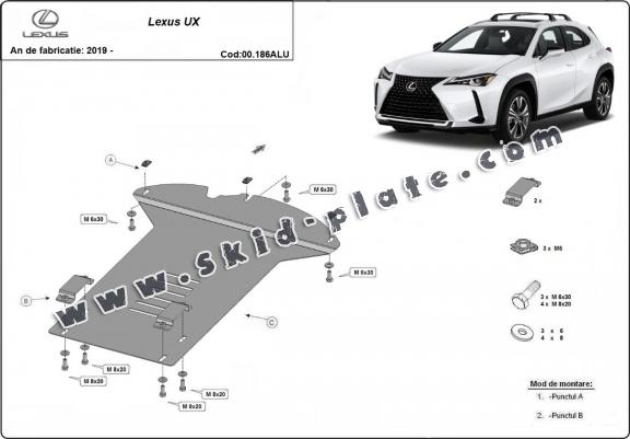Skid plate for the protection of the: Catalytic converter The skid plate is new and fits perfectly for all versions of Lexus UX manufactured between 2019 and 2025. Made out of 3 mm thick Aluminium plate. The shields are made of aluminum, but the mounting brackets are made of steel. Screws, nuts, clips, all fastening accessories are included. All skid plates are powder coated to prevent corrosion. The exterior of the skid plate is provided with Aluminium reinforcements, which increases the resistance to impact. |