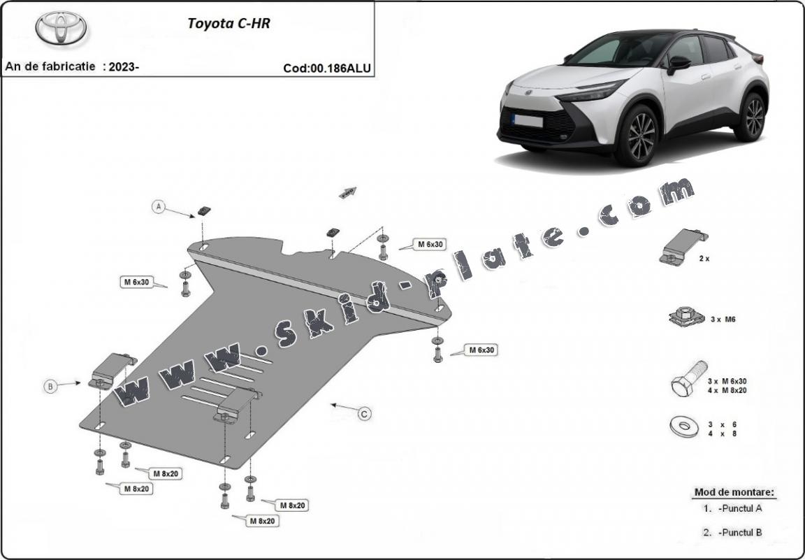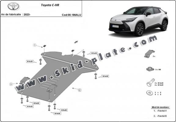 Skid plate for the protection of the: Catalytic converter The skid plate is new and fits perfectly for all versions of Toyota C-HR manufactured between 2023 and 2025. Made out of 3 mm thick Aluminium plate. The shields are made of aluminum, but the mounting brackets are made of steel. Screws, nuts, clips, all fastening accessories are included. All skid plates are powder coated to prevent corrosion. The exterior of the skid plate is provided with Aluminium reinforcements, which increases the resistance to impact. |