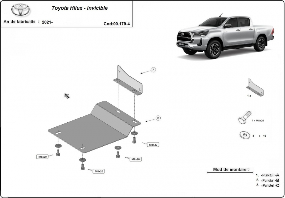 Skid plate for the protection of the: particle filter sensor The skid plate is new and fits perfectly for all versions of Toyota Hilux manufactured between 2021 and 2026. Made out of 4 mm thick Aluminium plate. The shields are made of aluminum, but the mounting brackets are made of steel. Screws, nuts, clips, all fastening accessories are included. All skid plates are powder coated to prevent corrosion. The exterior of the skid plate is provided with Aluminium reinforcements, which increases the resistance to impact. |