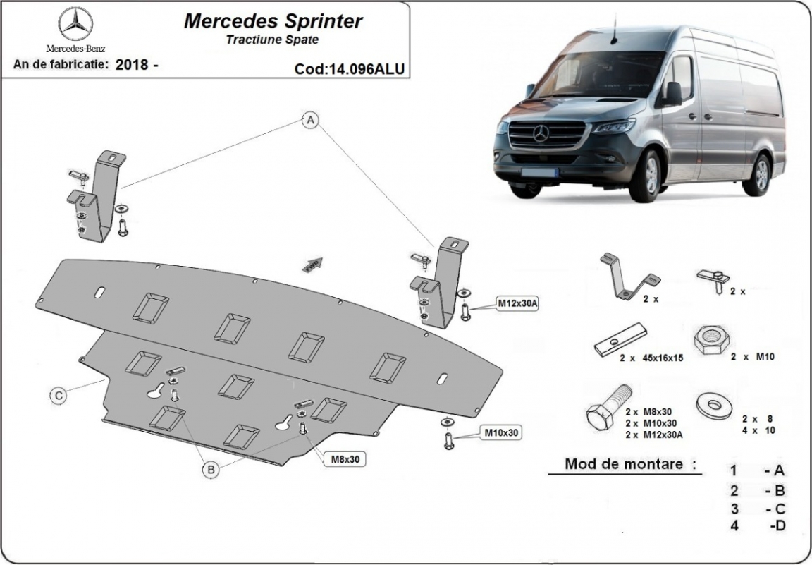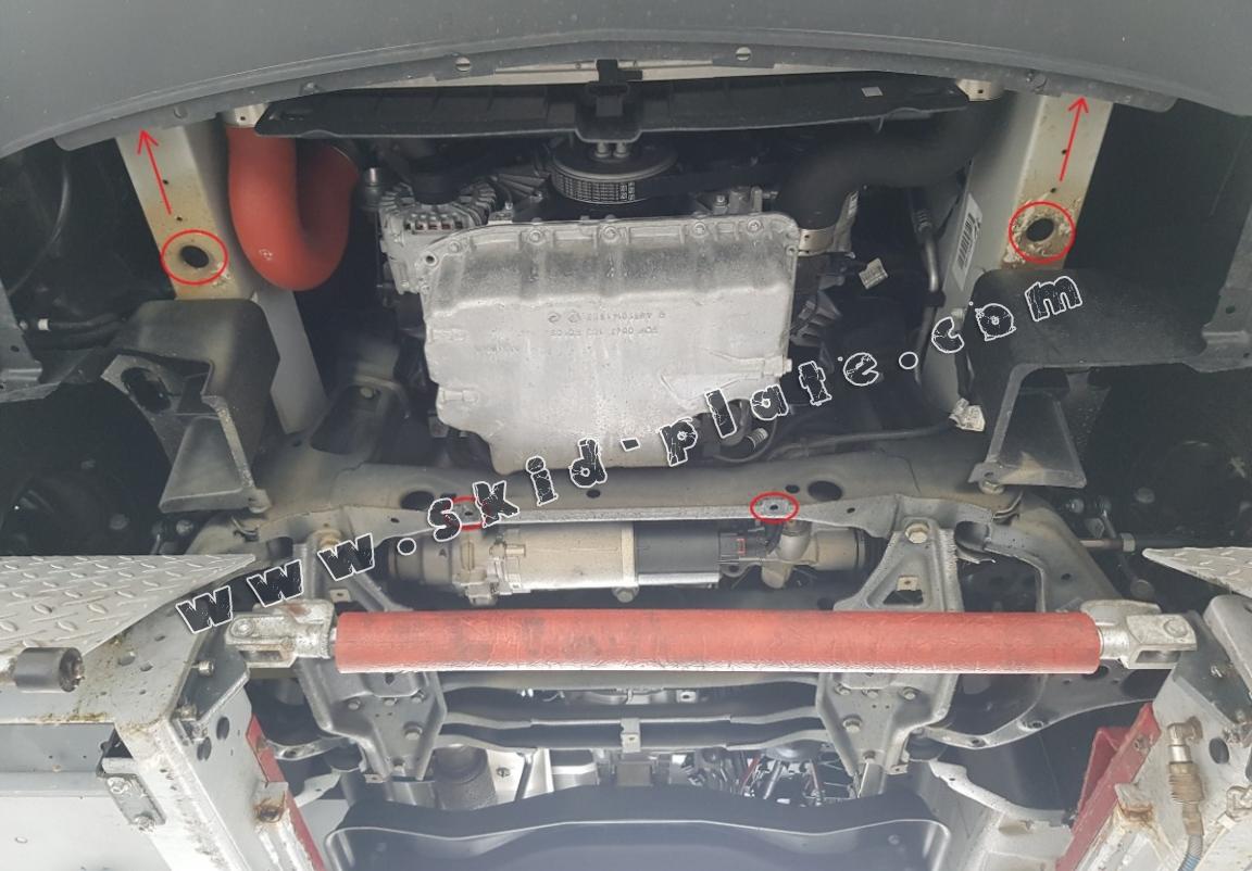 Skid plate for the protection of the: engine, radiator, front bumper The skid plate is new and fits perfectly for all versions of Mercedes Sprinter - RWD manufactured between 2018 and 2026. Made out of 3 mm thick Aluminium plate. The shields are made of aluminum, but the mounting brackets are made of steel. Screws, nuts, clips, all fastening accessories are included. All skid plates are powder coated to prevent corrosion. The exterior of the skid plate is provided with Aluminium reinforcements, which increases the resistance to impact. |