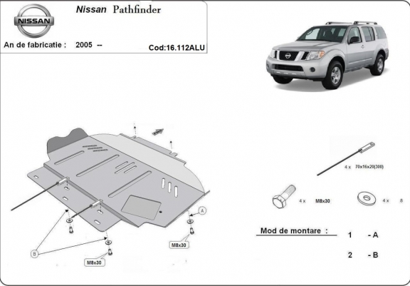 Skid plate for the protection of the: engine The skid plate is new and fits perfectly for all versions of Nissan Pathfinder manufactured between 2005 and 2026. Made out of 4 mm thick Aluminium plate. The shields are made of aluminum, but the mounting brackets are made of steel. Screws, nuts, clips, all fastening accessories are included. All skid plates are powder coated to prevent corrosion. The exterior of the skid plate is provided with Aluminium reinforcements, which increases the resistance to impact. |