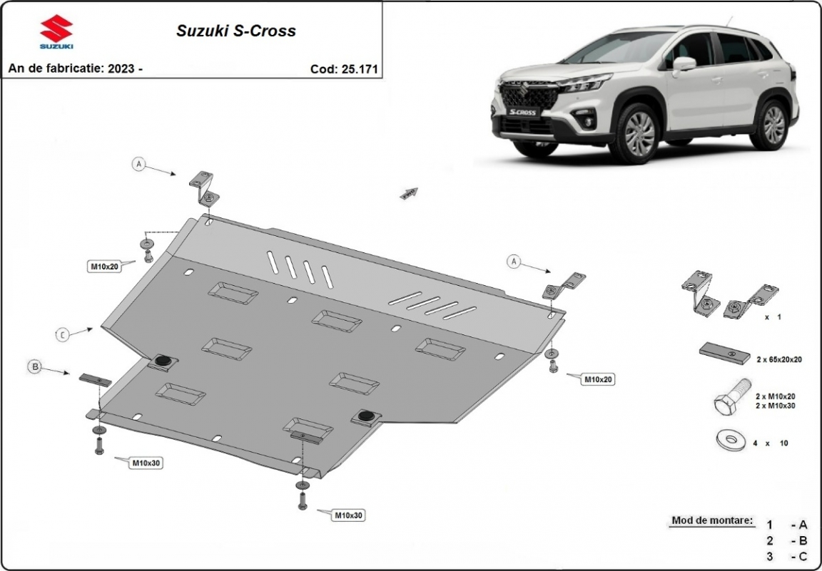 Skid plate for the protection of the: engine, gearbox The skid plate is new and fits perfectly for all versions of Suzuki S-Cross manufactured between 2023 and 2026. Made out of 4 mm thick Aluminium plate. The shields are made of aluminum, but the mounting brackets are made of steel. Screws, nuts, clips, all fastening accessories are included. All skid plates are powder coated to prevent corrosion. The exterior of the skid plate is provided with Aluminium reinforcements, which increases the resistance to impact. |