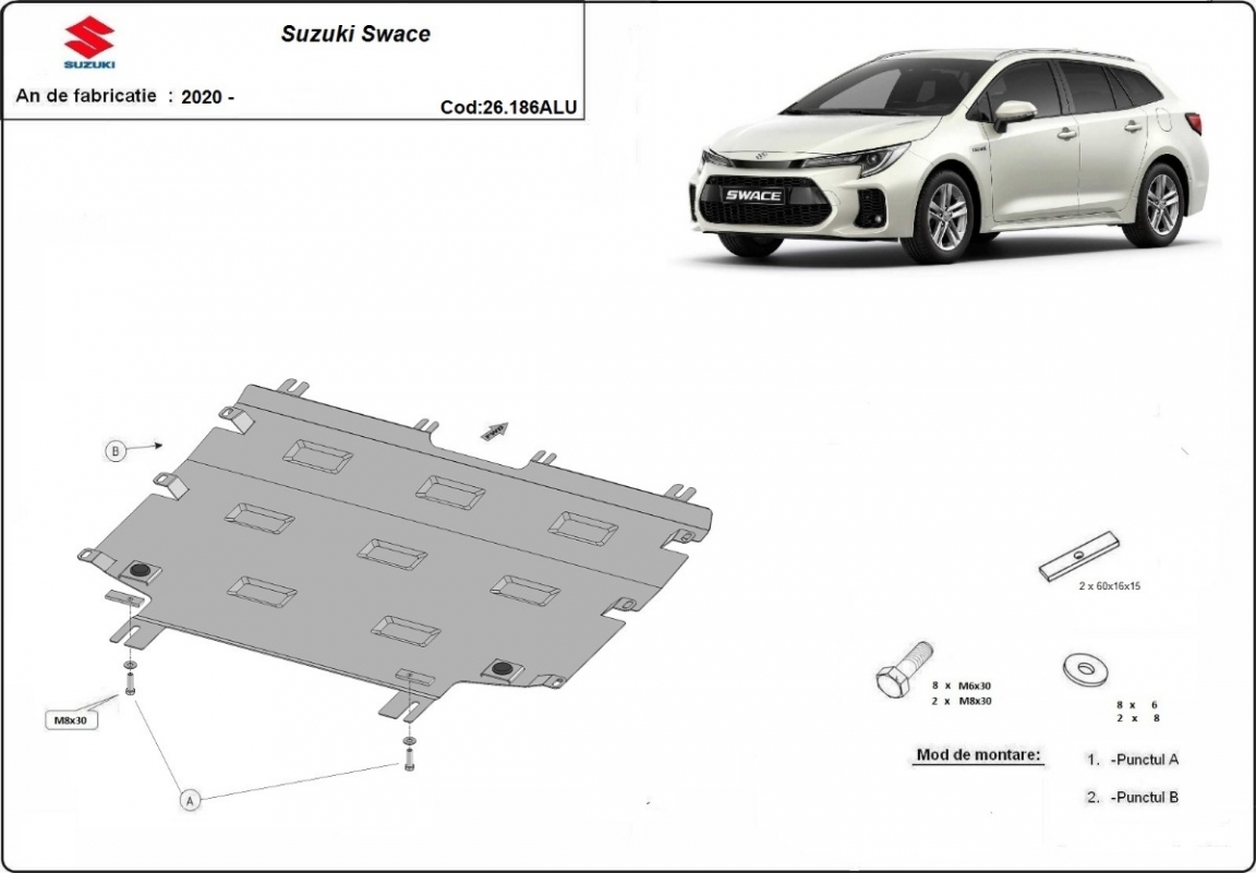 Skid plate for the protection of the: engine, gearbox The skid plate is new and fits perfectly for all versions of Suzuki Swace manufactured between 2020 and 2026. Made out of 3 mm thick Aluminium plate. The shields are made of aluminum, but the mounting brackets are made of steel. Screws, nuts, clips, all fastening accessories are included. All skid plates are powder coated to prevent corrosion. The exterior of the skid plate is provided with Aluminium reinforcements, which increases the resistance to impact. |