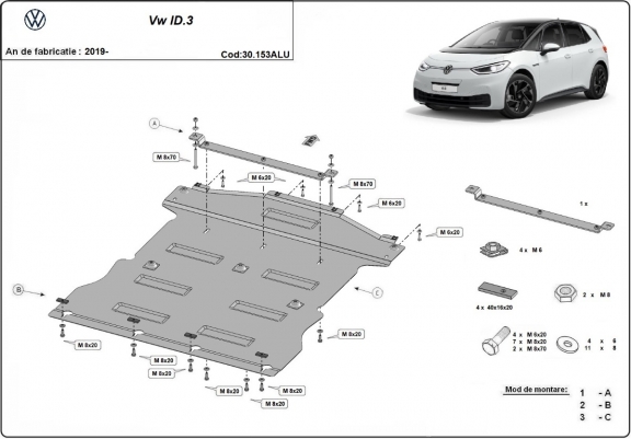 Skid plate for the protection of the: engine, gearbox, radiator The skid plate is new and fits perfectly for all versions of Volkswagen ID.3 manufactured between 2019 and 2026. Made out of 3 mm thick Aluminium plate. The shields are made of aluminum, but the mounting brackets are made of steel. Screws, nuts, clips, all fastening accessories are included. All skid plates are powder coated to prevent corrosion. The exterior of the skid plate is provided with Aluminium reinforcements, which increases the resistance to impact. |