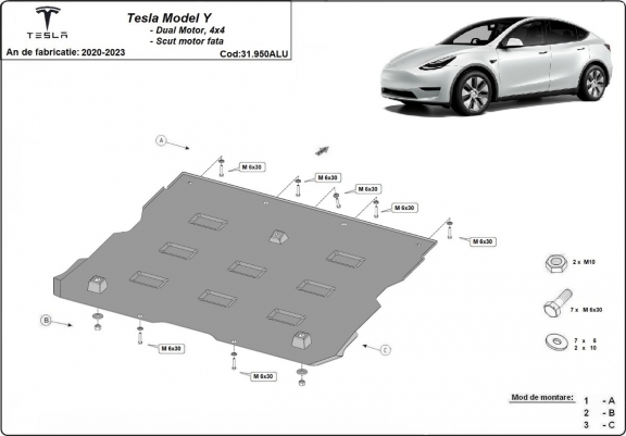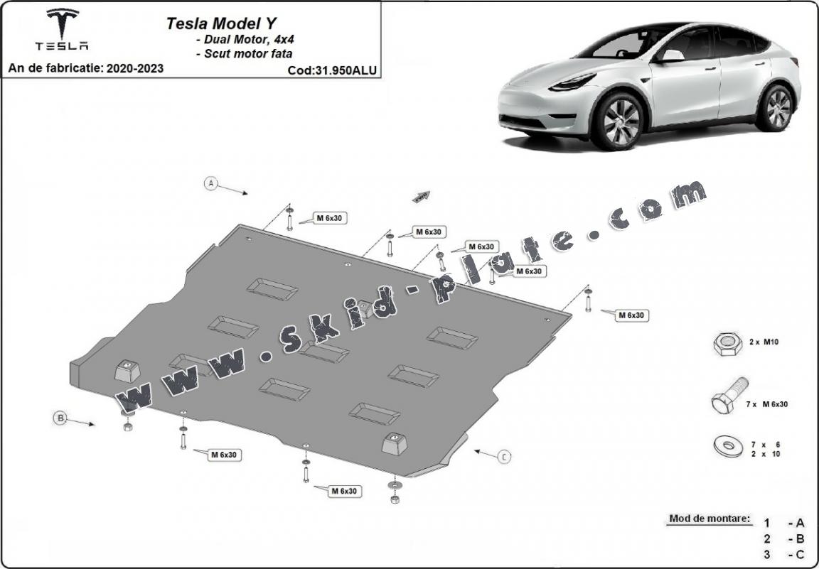 Skid plate for the protection of the: front electric motor The skid plate is new and fits perfectly for all versions of Tesla model Y manufactured between 2020 and 2023. Made out of 3 mm thick Aluminium plate. The shields are made of aluminum, but the mounting brackets are made of steel. Screws, nuts, clips, all fastening accessories are included. All skid plates are powder coated to prevent corrosion. The exterior of the skid plate is provided with Aluminium reinforcements, which increases the resistance to impact. |