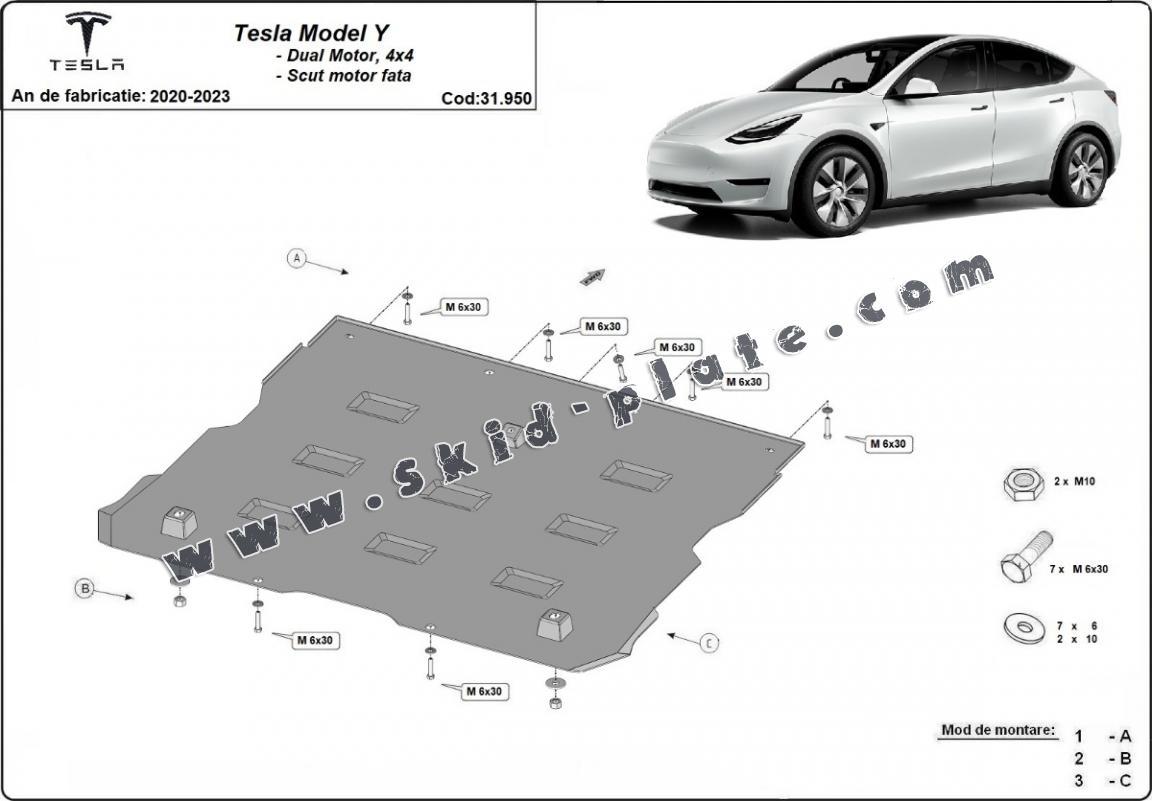 | Skid plate for the protection of the: front electric motor The skid plate is new and fits perfectly for the Tesla Model Y AWD, with the following engine/drive versions: Dual Motor - manufactured between 2020 and 2023. Made out of 2 mm thick Steel plate. Screws, nuts, clips, all fastening accessories are included. All skid plates are powder coated to prevent corrosion. The exterior of the skid plate is provided with Steel reinforcements, which increases the resistance to impact. |