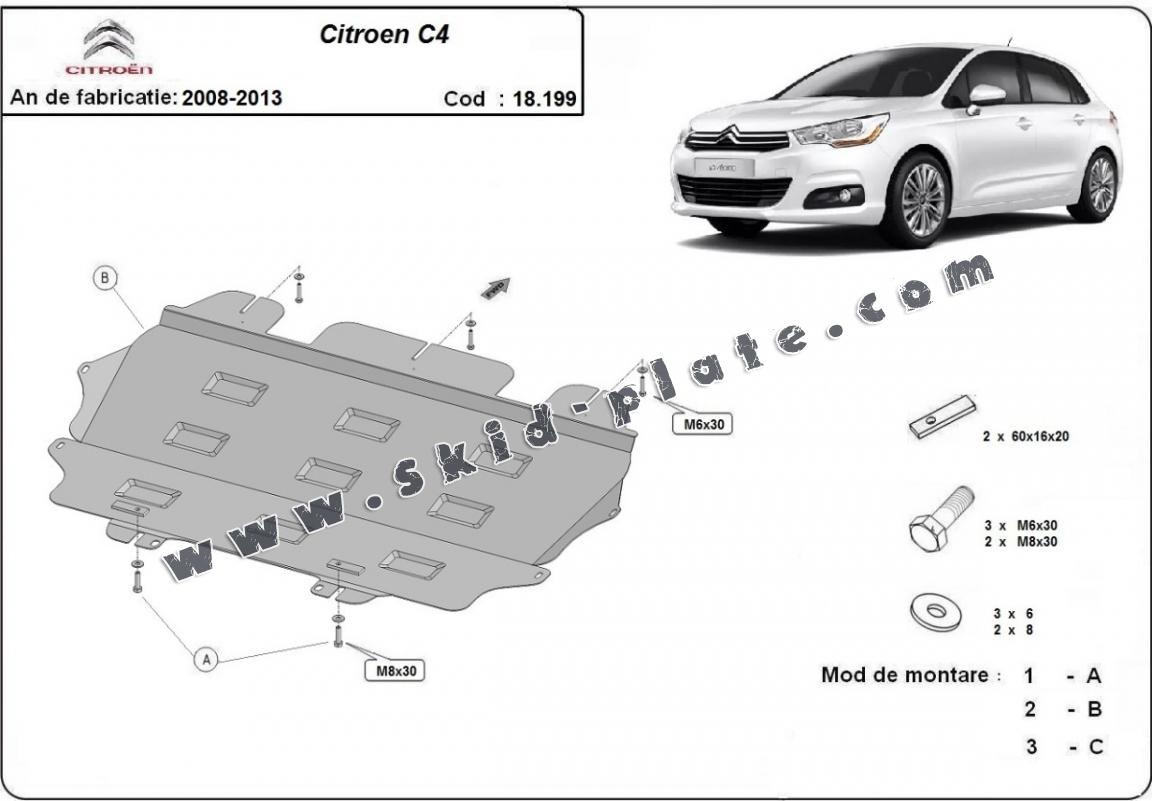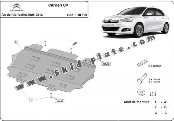 Skid plate for the protection of the: engine, gearbox The skid plate is new and fits perfectly for all versions of Citroen C4 manufactured between 2008 and 2013. Made out of 2 mm thick Steel plate. Screws, nuts, clips, all fastening accessories are included. All skid plates are powder coated to prevent corrosion. The exterior of the skid plate is provided with Steel reinforcements, which increases the resistance to impact. |