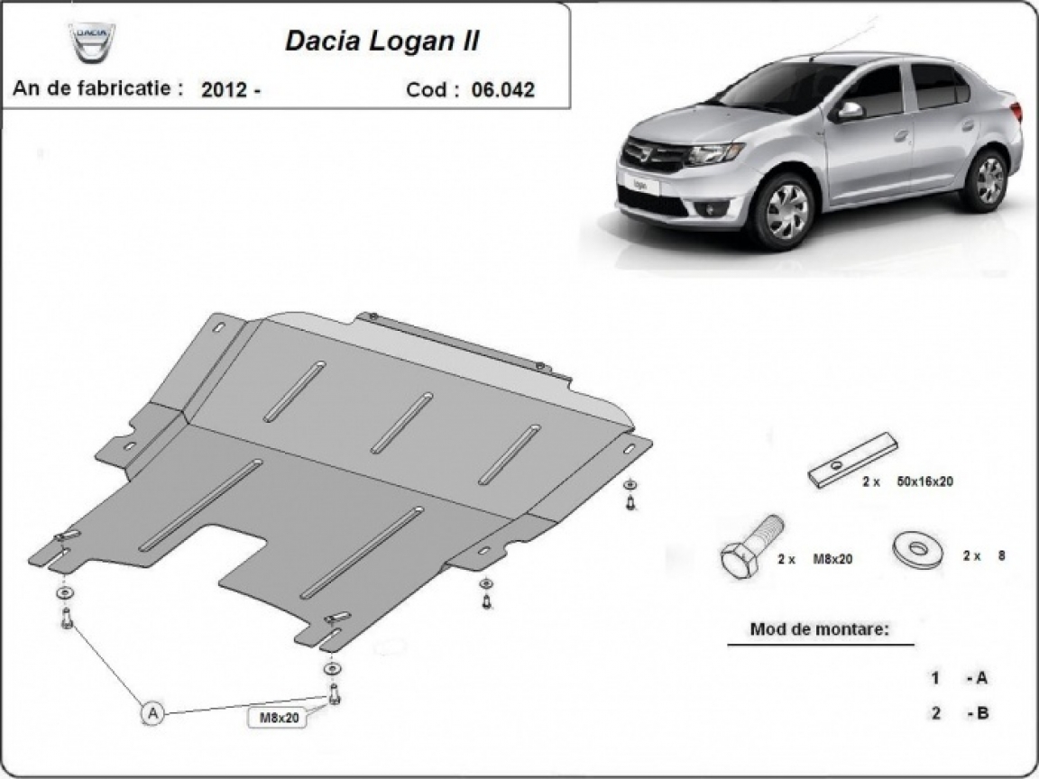 Skid plate for the protection of the: engine, gearbox The skid plate is new and fits perfectly for all versions of Dacia Logan 2 manufactured between 2012 and 2020. Made out of 2 mm thick Steel plate. Screws, nuts, clips, all fastening accessories are included. All skid plates are powder coated to prevent corrosion. The exterior of the skid plate is provided with Steel reinforcements, which increases the resistance to impact. |