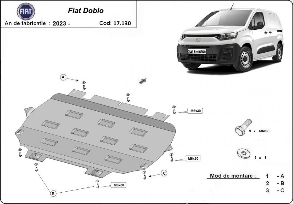 Skid plate for the protection of the: engine, gearbox, radiator The skid plate is new and fits perfectly for all versions of Fiat Doblo manufactured between 2023 and 2026. Made out of 2 mm thick Steel plate. Screws, nuts, clips, all fastening accessories are included. All skid plates are powder coated to prevent corrosion. The exterior of the skid plate is provided with Steel reinforcements, which increases the resistance to impact. |