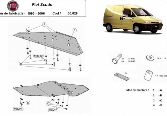 Skid plate for the protection of the: engine, gearbox, radiator, front bumper The skid plate is new and fits perfectly for all versions of Fiat Scudo manufactured between 1995 and 2006. Made out of 2 mm thick Steel plate. Screws, nuts, clips, all fastening accessories are included. All skid plates are powder coated to prevent corrosion. The exterior of the skid plate is provided with Steel reinforcements, which increases the resistance to impact. |