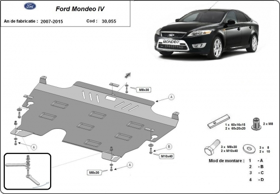 Skid plate for the protection of the: engine, gearbox, radiator The skid plate is new and fits perfectly for all versions of Ford Mondeo 4 manufactured between 2007 and 2015. Made out of 2 mm thick Steel plate. Screws, nuts, clips, all fastening accessories are included. All skid plates are powder coated to prevent corrosion. The exterior of the skid plate is provided with Steel reinforcements, which increases the resistance to impact. |
