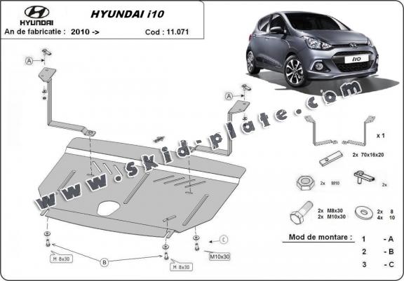 Skid plate for the protection of the: engine, gearbox, radiator The skid plate is new and fits perfectly for the Hyundai i10, with the following engine/drive versions: - manufactured between 2012 and 2017. Made out of 2 mm thick Steel plate. Screws, nuts, clips, all fastening accessories are included. All skid plates are powder coated to prevent corrosion. The exterior of the skid plate is provided with Steel reinforcements, which increases the resistance to impact. |