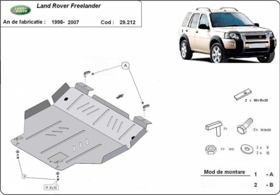 Skid plate for the protection of the: engine, gearbox The skid plate is new and fits perfectly for all versions of Land Rover Freelander manufactured between 1998 and 2007. It has an opening for the oil sump, so it's removal won't be necessary to change the oil. Made out of 3 mm thick Steel plate. Screws, nuts, clips, all fastening accessories are included. All skid plates are powder coated to prevent corrosion. The exterior of the skid plate is provided with Steel reinforcements, which increases the resistance to impact. |