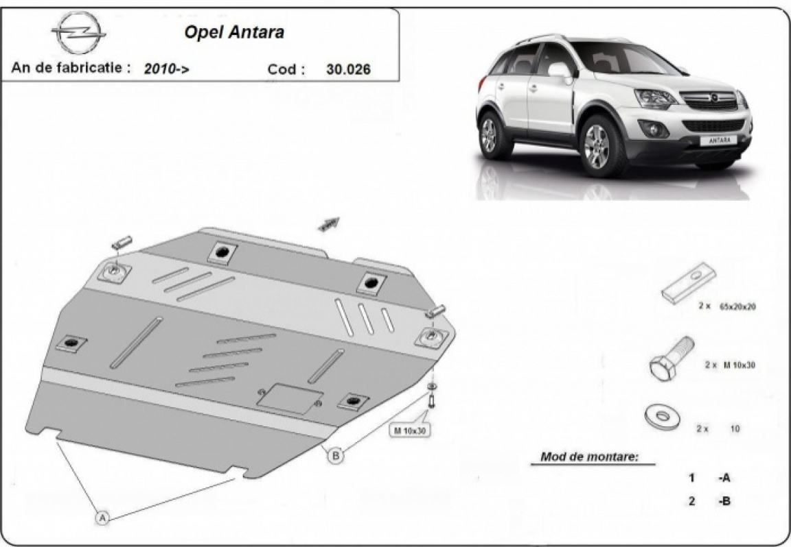 Skid plate for the protection of the: engine, gearbox The skid plate is new and fits perfectly for all versions of Opel Antara manufactured between 2010 and 2015. It has an opening for the oil sump, so it's removal won't be necessary to change the oil. Made out of 2 mm thick Steel plate. Screws, nuts, clips, all fastening accessories are included. All skid plates are powder coated to prevent corrosion. The exterior of the skid plate is provided with Steel reinforcements, which increases the resistance to impact. |