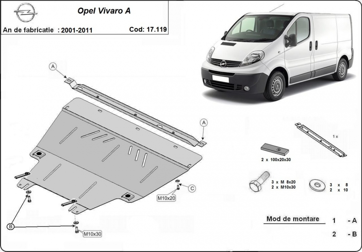 Skid plate for the protection of the: engine, gearbox, radiator The skid plate is new and fits perfectly for all versions of Opel Vivaro manufactured between 2001 and 2011. Made out of 2 mm thick Steel plate. Screws, nuts, clips, all fastening accessories are included. All skid plates are powder coated to prevent corrosion. The exterior of the skid plate is provided with Steel reinforcements, which increases the resistance to impact. |