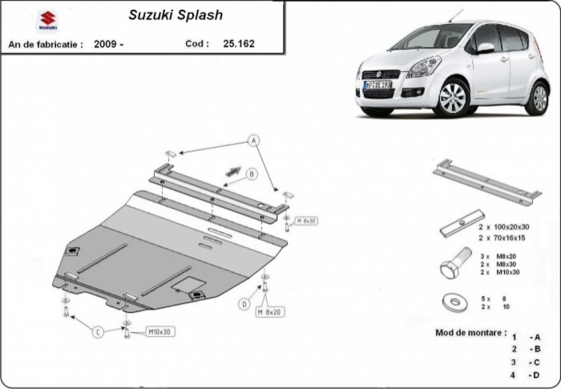 Skid plate for the protection of the: engine, gearbox The skid plate is new and fits perfectly for all versions of Suzuki Splash an manufactured between 2009 and 2016. It has an opening for the oil sump, so it's removal won't be necessary to change the oil. Made out of 2 mm thick Steel plate. Screws, nuts, clips, all fastening accessories are included. All skid plates are powder coated to prevent corrosion. The exterior of the skid plate is provided with Steel reinforcements, which increases the resistance to impact. |
