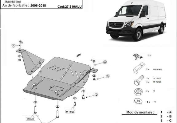 Skid plate for the protection of the: engine, gearbox The skid plate is new and fits perfectly for all versions of Mercedes Sprinter manufactured between 2006 and 2018. Made out of 3 mm thick Aluminium plate. The shields are made of aluminum, but the mounting brackets are made of steel. Screws, nuts, clips, all fastening accessories are included. All skid plates are powder coated to prevent corrosion. The exterior of the skid plate is provided with Aluminium reinforcements, which increases the resistance to impact. |