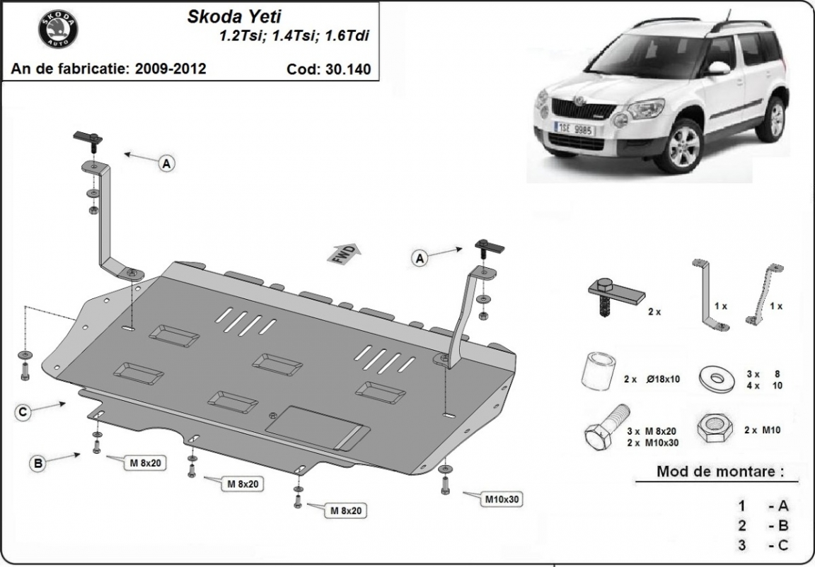Steel skid plate for the protection of the engine and the gearbox for Skoda Yeti (2009-2012)