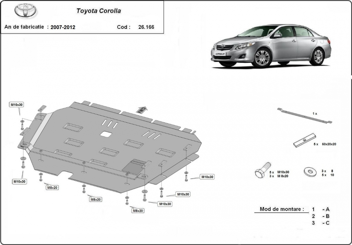 Skid plate for the protection of the: engine The skid plate is new and fits perfectly for all versions of Toyota Corolla manufactured between 2007 and 2012. It has an opening for the oil sump, so it's removal won't be necessary to change the oil. Made out of 2 mm thick Steel plate. Screws, nuts, clips, all fastening accessories are included. All skid plates are powder coated to prevent corrosion. The exterior of the skid plate is provided with Steel reinforcements, which increases the resistance to impact. |