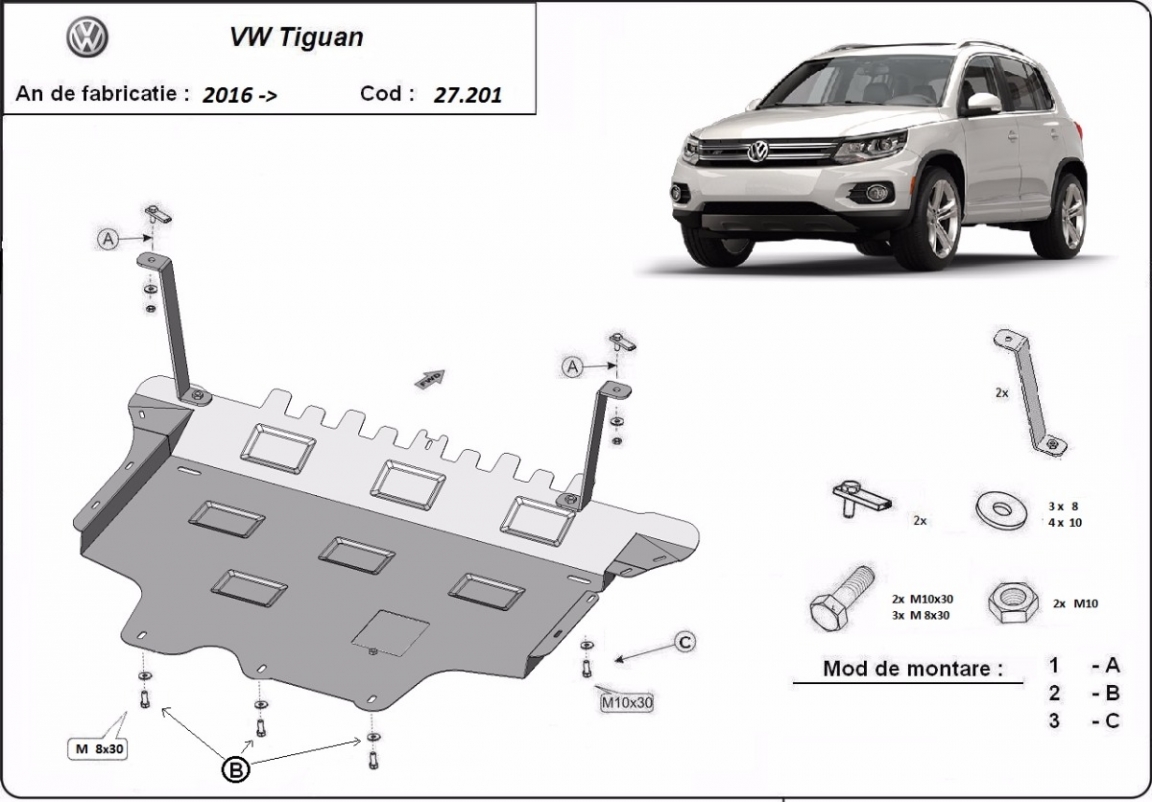 Skid plate for the protection of the: engine, gearbox, radiator, front bumper The skid plate is new and fits perfectly for all versions of Vw Tiguan manufactured between 2016 and 2024. It has an opening for the oil sump, so it's removal won't be necessary to change the oil. Made out of 2 mm thick Steel plate. Screws, nuts, clips, all fastening accessories are included. All skid plates are powder coated to prevent corrosion. The exterior of the skid plate is provided with Steel reinforcements, which increases the resistance to impact. |