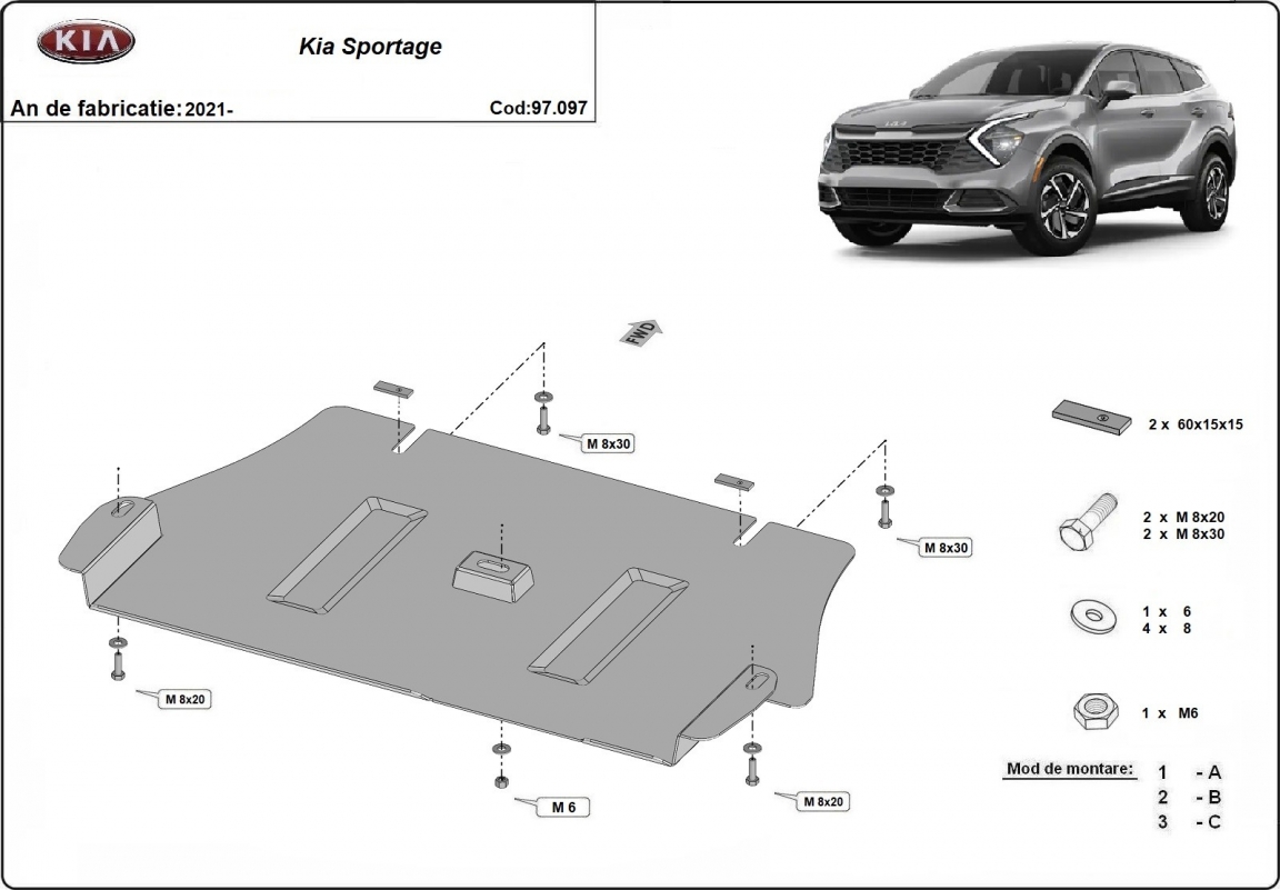 Skid plate for the protection of the: Catalytic converter The skid plate is new and fits perfectly for all versions of Kia sportage manufactured between 2021 and 2026. Made out of 2 mm thick Steel plate. Screws, nuts, clips, all fastening accessories are included. All skid plates are powder coated to prevent corrosion. The exterior of the skid plate is provided with Steel reinforcements, which increases the resistance to impact. |