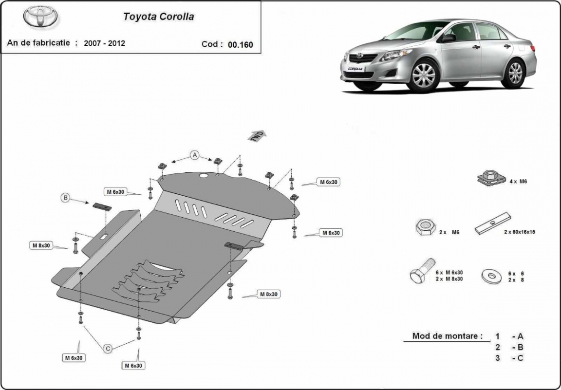 Skid plate for the protection of the: Catalytic converter The skid plate is new and fits perfectly for all versions of Toyota Corolla manufactured between 2007 and 2012. Made out of 2 mm thick Steel plate. Screws, nuts, clips, all fastening accessories are included. All skid plates are powder coated to prevent corrosion. The exterior of the skid plate is provided with Steel reinforcements, which increases the resistance to impact. |