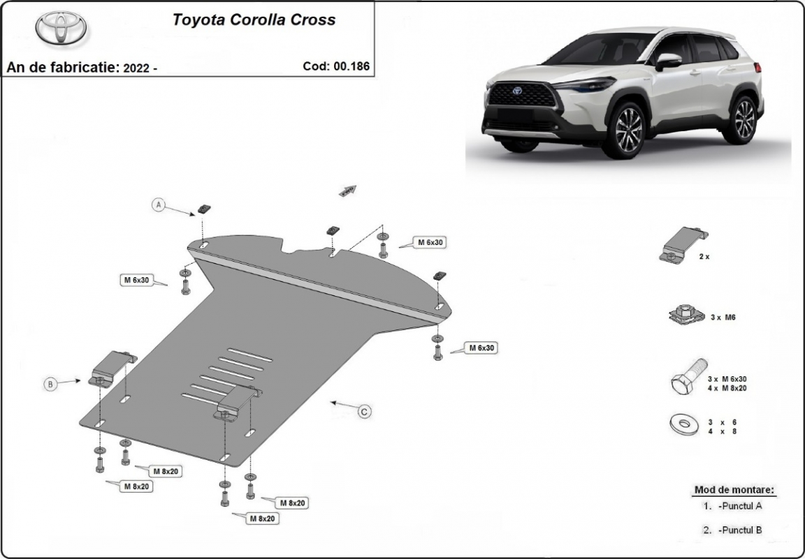 Skid plate for the protection of the: Catalytic converter The skid plate is new and fits perfectly for all versions of Toyota Corolla Cross manufactured between 2022 and 2026. Made out of 2 mm thick Steel plate. Screws, nuts, clips, all fastening accessories are included. All skid plates are powder coated to prevent corrosion. The exterior of the skid plate is provided with Steel reinforcements, which increases the resistance to impact. |