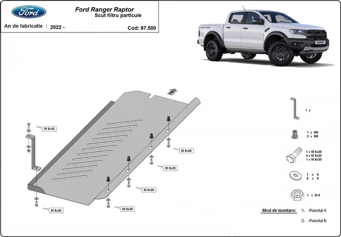 Skid plate for the protection of the: DPF , particle filter The skid plate is new and fits perfectly for all versions of Ford Ranger Raptor manufactured between 2020 and 2023. Made out of 2 mm thick Steel plate. Screws, nuts, clips, all fastening accessories are included. All skid plates are powder coated to prevent corrosion. The exterior of the skid plate is provided with Steel reinforcements, which increases the resistance to impact. |