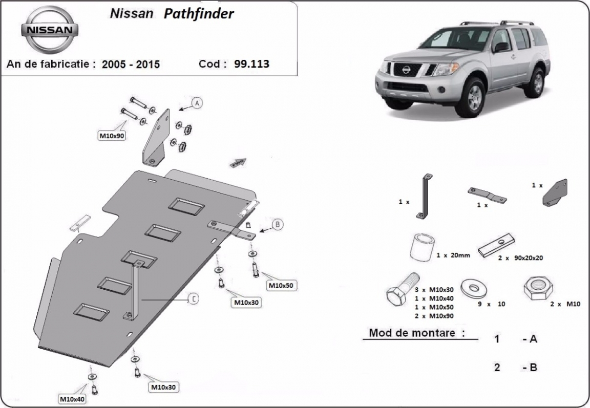 Skid plate for the protection of the: fuel tank The skid plate is new and fits perfectly for all versions of Nissan Pathfinder R51 manufactured between 2005 and 2015. Made out of 2.5 mm thick Steel plate. Screws, nuts, clips, all fastening accessories are included. All skid plates are powder coated to prevent corrosion. The exterior of the skid plate is provided with Steel reinforcements, which increases the resistance to impact. |