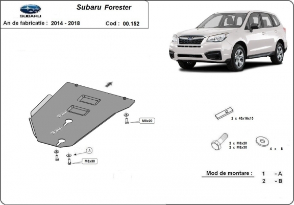 Skid plate for the protection of the: gearbox The skid plate is new and fits perfectly for all versions of Subaru Forester 4 manufactured between 2014 and 2018. Made out of 2 mm thick Steel plate. Screws, nuts, clips, all fastening accessories are included. All skid plates are powder coated to prevent corrosion. The exterior of the skid plate is provided with Steel reinforcements, which increases the resistance to impact. |