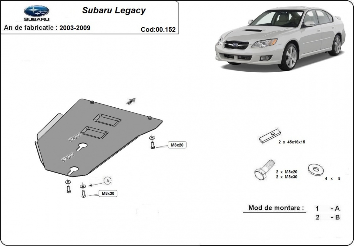 Skid plate for the protection of the: gearbox The skid plate is new and fits perfectly for all versions of Subaru Legacy manufactured between 2003 and 2009. Made out of 2 mm thick Steel plate. Screws, nuts, clips, all fastening accessories are included. All skid plates are powder coated to prevent corrosion. The exterior of the skid plate is provided with Steel reinforcements, which increases the resistance to impact. |