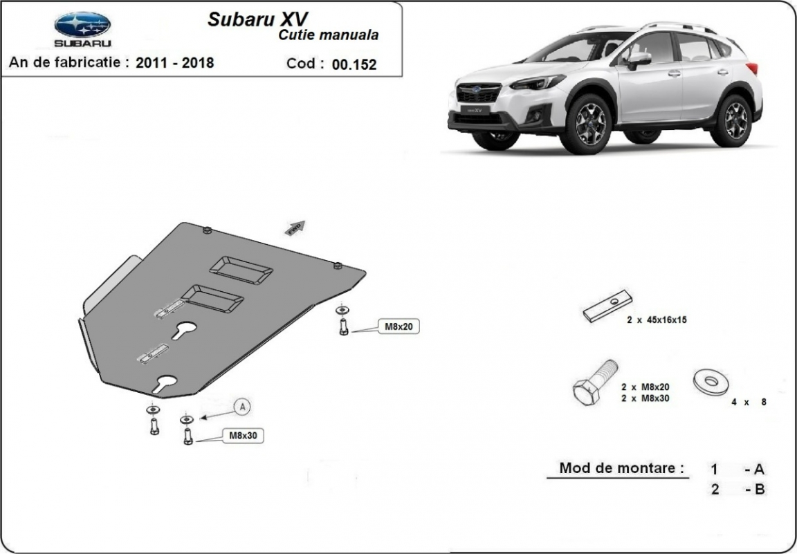 Skid plate for the protection of the: gearbox The skid plate is new and fits perfectly for all versions of Subaru XV manufactured between 2011 and 2017. Made out of 2 mm thick Steel plate. Screws, nuts, clips, all fastening accessories are included. All skid plates are powder coated to prevent corrosion. The exterior of the skid plate is provided with Steel reinforcements, which increases the resistance to impact. |