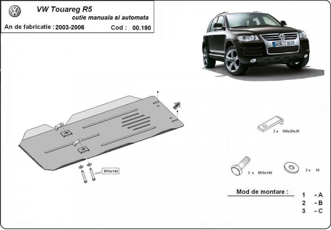 Skid plate for the protection of the: gearbox The skid plate is new and fits perfectly for all versions of VW Touareg 7L manufactured between 2003 and 2006. Made out of 3 mm thick Steel plate. Screws, nuts, clips, all fastening accessories are included. All skid plates are powder coated to prevent corrosion. The exterior of the skid plate is provided with Steel reinforcements, which increases the resistance to impact. |