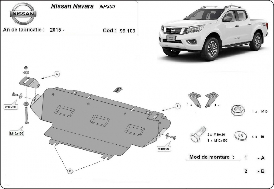 Skid plate for the protection of the: radiator The skid plate is new and fits perfectly for all versions of Nissan Navara NP300 manufactured between 2015 and 2021. Made out of 2 mm thick Steel plate. Screws, nuts, clips, all fastening accessories are included. All skid plates are powder coated to prevent corrosion. The exterior of the skid plate is provided with Steel reinforcements, which increases the resistance to impact. |