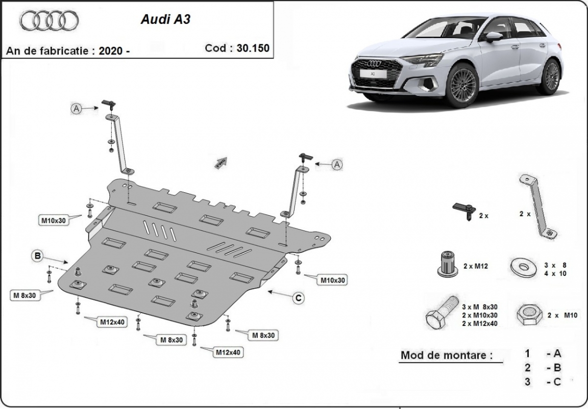 Skid plate for the protection of the: engine, gearbox, radiator The skid plate is new and fits perfectly for all versions of Audi A3 manufactured between 2020 and 2026. Made out of 2 mm thick Steel plate. Screws, nuts, clips, all fastening accessories are included. All skid plates are powder coated to prevent corrosion. The exterior of the skid plate is provided with Steel reinforcements, which increases the resistance to impact. |