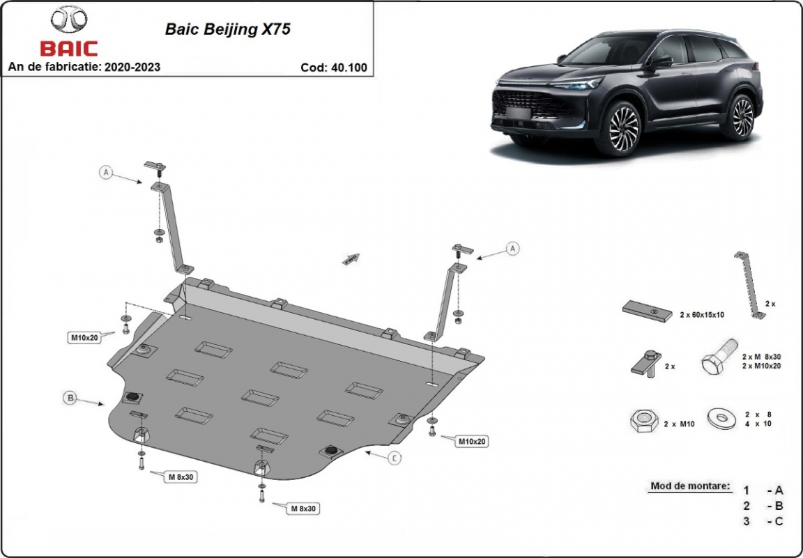 Skid plate for the protection of the: engine, gearbox, radiator The skid plate is new and fits perfectly for all versions of Baic Beijing X75 manufactured between 2020 and 2023. Made out of 2 mm thick Steel plate. Screws, nuts, clips, all fastening accessories are included. All skid plates are powder coated to prevent corrosion. The exterior of the skid plate is provided with Steel reinforcements, which increases the resistance to impact. |