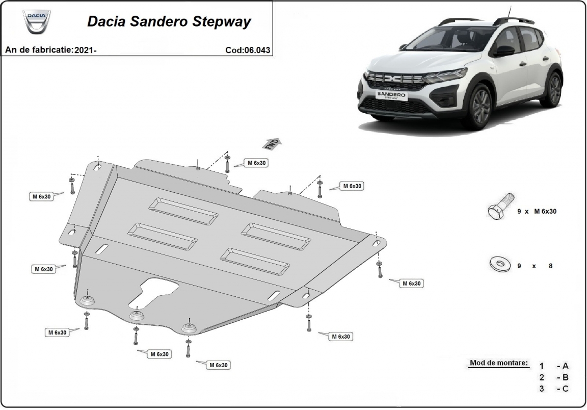 Skid plate for the protection of the: engine, gearbox The skid plate is new and fits perfectly for all versions of Dacia Sandero 3 Stepway manufactured between 2021 and 2026. Made out of 2 mm thick Steel plate. Screws, nuts, clips, all fastening accessories are included. All skid plates are powder coated to prevent corrosion. The exterior of the skid plate is provided with Steel reinforcements, which increases the resistance to impact. |