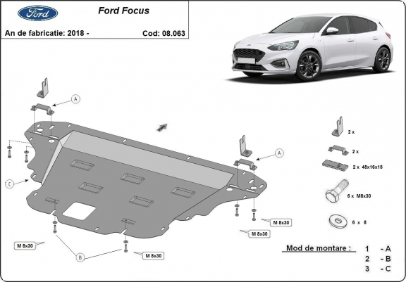 Skid plate for the protection of the: engine, gearbox, radiator, front bumper The skid plate is new and fits perfectly for all versions of Ford Focus 4 manufactured between 2018 and 2026. Made out of 2 mm thick Steel plate. Screws, nuts, clips, all fastening accessories are included. All skid plates are powder coated to prevent corrosion. The exterior of the skid plate is provided with Steel reinforcements, which increases the resistance to impact. |