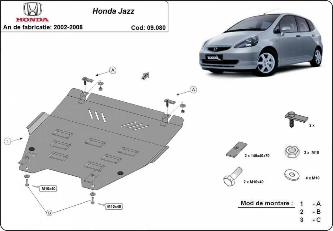 Skid plate for the protection of the: engine, radiator, front bumper The skid plate is new and fits perfectly for all versions of Honda Jazz manufactured between 2002 and 2008. Made out of 2 mm thick Steel plate. Screws, nuts, clips, all fastening accessories are included. All skid plates are powder coated to prevent corrosion. The exterior of the skid plate is provided with Steel reinforcements, which increases the resistance to impact. |