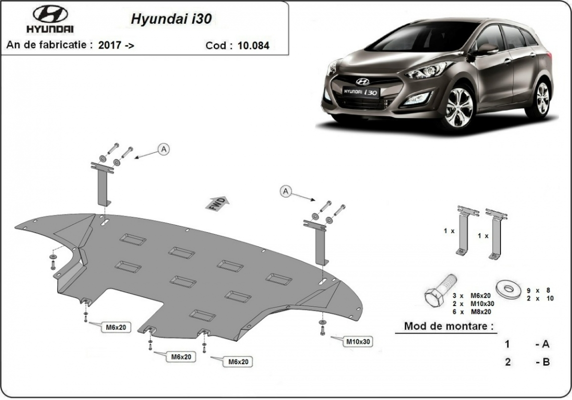 Skid plate for the protection of the: engine, gearbox, radiator, front bumper The skid plate is new and fits perfectly for all versions of Hyundai I30 manufactured between 2017 and 2026. Made out of 2 mm thick Steel plate. Screws, nuts, clips, all fastening accessories are included. All skid plates are powder coated to prevent corrosion. The exterior of the skid plate is provided with Steel reinforcements, which increases the resistance to impact. |