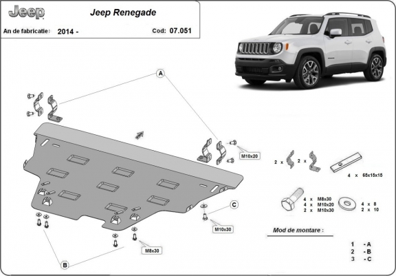 Skid plate for the protection of the: engine, gearbox, radiator, front bumper The skid plate is new and fits perfectly for all versions of Jeep Renegade manufactured between 2014 and 2026. Made out of 2 mm thick Steel plate. Screws, nuts, clips, all fastening accessories are included. All skid plates are powder coated to prevent corrosion. The exterior of the skid plate is provided with Steel reinforcements, which increases the resistance to impact. |