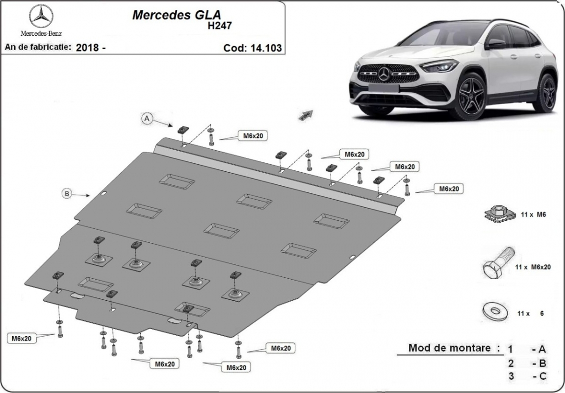 Skid plate for the protection of the: engine, gearbox, radiator The skid plate is new and fits perfectly for all versions of Mercedes GLA H247 manufactured between 2019 and 2026. Made out of 2 mm thick Steel plate. Screws, nuts, clips, all fastening accessories are included. All skid plates are powder coated to prevent corrosion. The exterior of the skid plate is provided with Steel reinforcements, which increases the resistance to impact. |