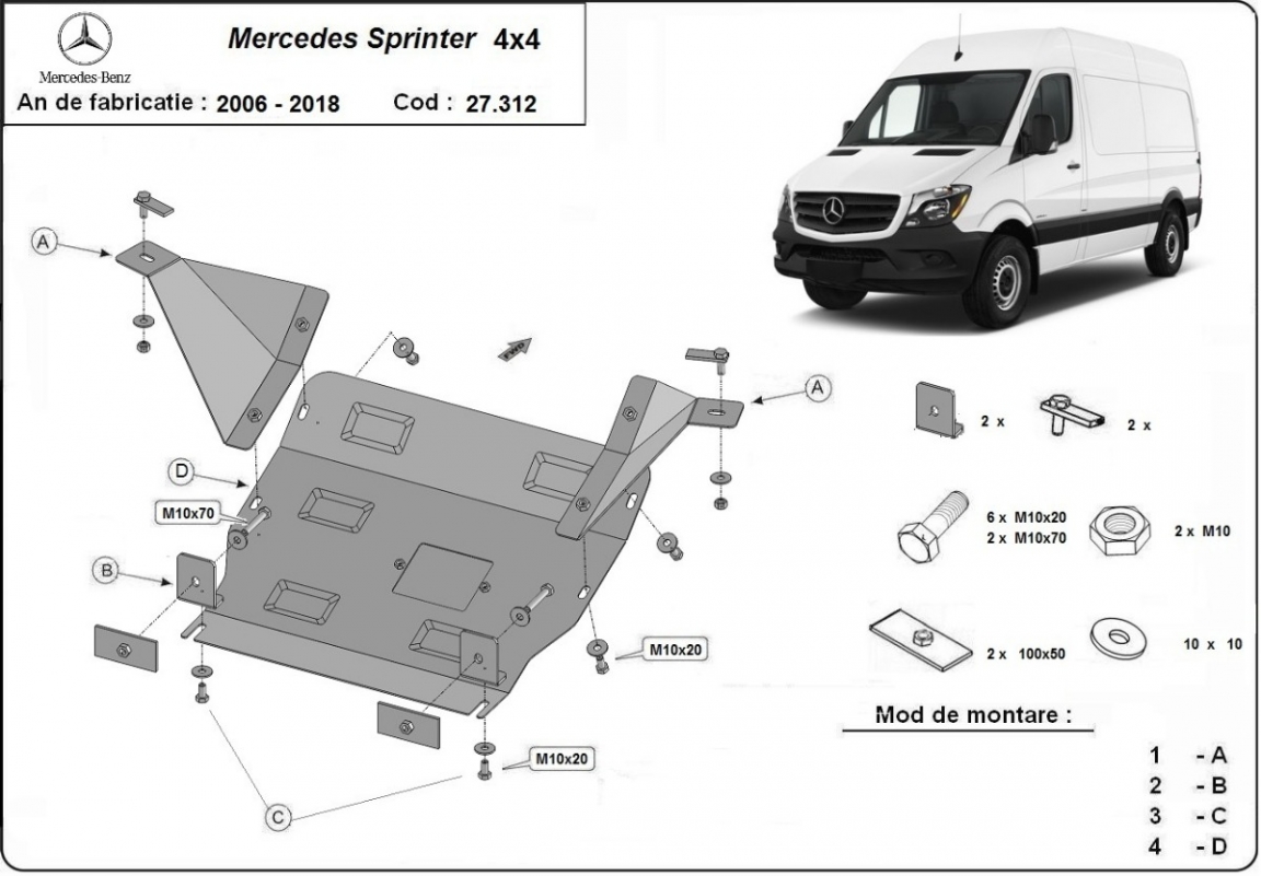 Skid plate for the protection of the: engine The skid plate is new and fits perfectly for the Mercedes Sprinter 4x4, with the following engine/drive versions: 4x4 - manufactured between 2006 and 2018. It has an opening for the oil sump, so it's removal won't be necessary to change the oil. Made out of 2.5 mm thick Steel plate. Screws, nuts, clips, all fastening accessories are included. All skid plates are powder coated to prevent corrosion. The exterior of the skid plate is provided with Steel reinforcements, which increases the resistance to impact. |