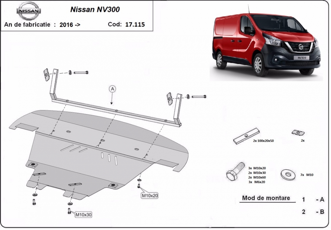 Skid plate for the protection of the: engine, gearbox, radiator, front bumper The skid plate is new and fits perfectly for all versions of Nissan NV300 manufactured between 2014 and 2021. Made out of 2 mm thick Steel plate. Screws, nuts, clips, all fastening accessories are included. All skid plates are powder coated to prevent corrosion. The exterior of the skid plate is provided with Steel reinforcements, which increases the resistance to impact. |