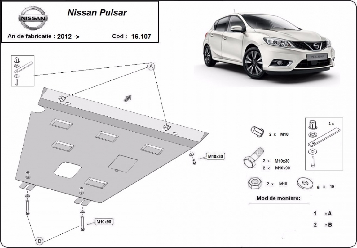 Skid plate for the protection of the: engine, gearbox The skid plate is new and fits perfectly for all versions of Nissan Pulsar manufactured between 2012 and 2018. It has an opening for the oil sump, so it's removal won't be necessary to change the oil. Made out of 2 mm thick Steel plate. Screws, nuts, clips, all fastening accessories are included. All skid plates are powder coated to prevent corrosion. The exterior of the skid plate is provided with Steel reinforcements, which increases the resistance to impact. |