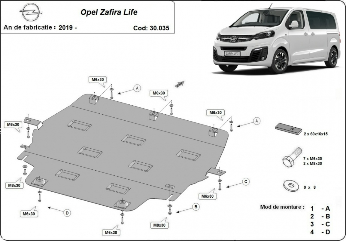 Skid plate for the protection of the: engine, gearbox, radiator The skid plate is new and fits perfectly for all versions of Opel Zafira Life manufactured between 2019 and 2026. Made out of 2 mm thick Steel plate. Screws, nuts, clips, all fastening accessories are included. All skid plates are powder coated to prevent corrosion. The exterior of the skid plate is provided with Steel reinforcements, which increases the resistance to impact. |