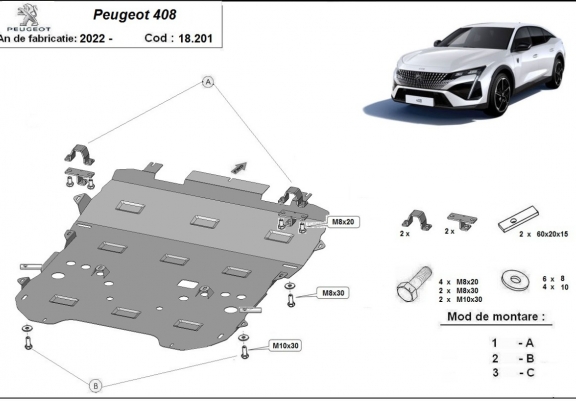 Skid plate for the protection of the: engine, gearbox, radiator, front bumper, subframe The skid plate is new and fits perfectly for all versions of Peugeot 408 manufactured between 2022 and 2026. Made out of 2 mm thick Steel plate. Screws, nuts, clips, all fastening accessories are included. All skid plates are powder coated to prevent corrosion. The exterior of the skid plate is provided with Steel reinforcements, which increases the resistance to impact. |