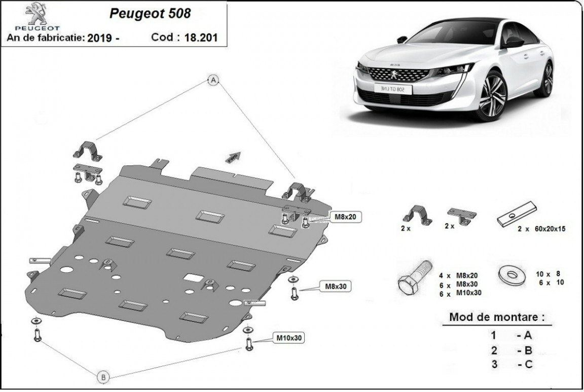Skid plate for the protection of the: engine, gearbox, radiator, front bumper, subframe The skid plate is new and fits perfectly for all versions of Peugeot 508 manufactured between 2018 and 2026. Made out of 2 mm thick Steel plate. Screws, nuts, clips, all fastening accessories are included. All skid plates are powder coated to prevent corrosion. The exterior of the skid plate is provided with Steel reinforcements, which increases the resistance to impact. |