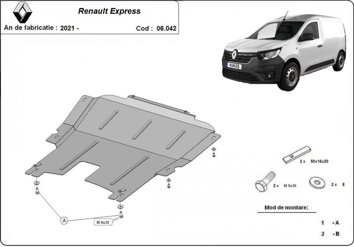 Skid plate for the protection of the: engine, gearbox, radiator The skid plate is new and fits perfectly for all versions of Renault Express manufactured between 2021 and 2026. Made out of 2 mm thick Steel plate. Screws, nuts, clips, all fastening accessories are included. All skid plates are powder coated to prevent corrosion. The exterior of the skid plate is provided with Steel reinforcements, which increases the resistance to impact. |