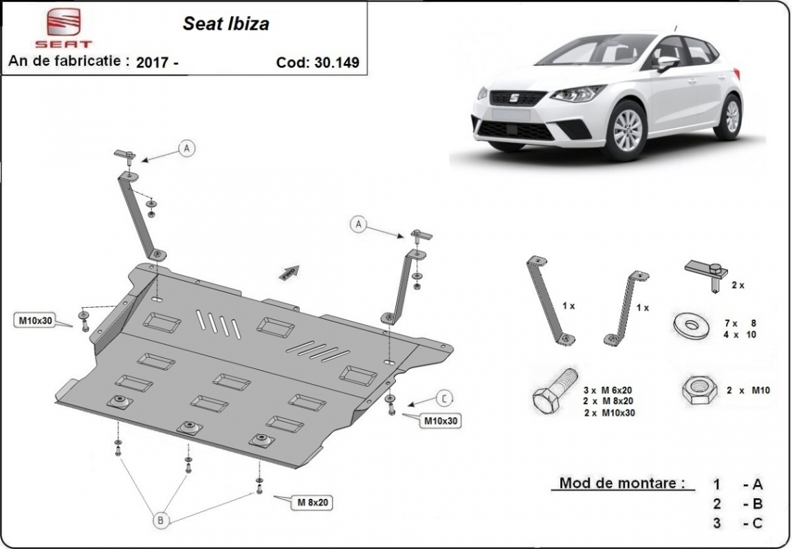 Skid plate for the protection of the: engine, gearbox, radiator, front bumper The skid plate is new and fits perfectly for all versions of Seat Ibiza manufactured between 2017 and 2026. Made out of 2 mm thick Steel plate. Screws, nuts, clips, all fastening accessories are included. All skid plates are powder coated to prevent corrosion. The exterior of the skid plate is provided with Steel reinforcements, which increases the resistance to impact. |
